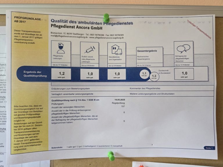 Ambulanter Pflegedienst - Pflege mit Herz Vertrauen Sie dem ambulanten Pflegedienst ANCORA Individuelle Pflege und Betreuung in der Häuslichkeit Beratung und Anleitung für Patienten und Angehörige Unterstützung und Entlastung - Individuelle Einsatzzeiten nach Wunsch Vermeidung oder Verzögerung von Heimaufenthalten Hilfe bei der Beantragung von Leistungen der Pflegeversicherung Spezielle Pflegeberatung nach § 45, SGB XI Betreuungsleistungen für Personen mit erheblich eingeschränkter Alltagskompetenz BÜROFACHKRAFTDeniseTELEFON 0821/90 79 65 88FAX 0821/90 79 65 89 UNSER TEAM ANCORA Pflegedienst – Ein starkes Team Fachkompetenz und achtsame Pflege rund um die Uhr Qualitätsbericht des MDK GRUNDPFLEGE (SGB XI)KörperpflegeAn- und AuskleidenHilfe bei der NahrungsaufnahmeMobilisierung/ Förderung der BeweglichkeitLagerungProphylaxen BEHANDLUNGSPFLEGE (SGB V)BlutzuckermessungBlutdruckmessungMedikamentengabeWundversorgungInjektionSubcutaninfusion SPEZIELLE VERSORGUNGPortversorgungKatheterpflegeStomapflegeSondenernährungPalliativpflege VERHINDERUNGSPFLEGE Wir übernehmen die Arbeiten für pflegende Angehörige, bei deren Abwesenheit nach Vereinbarung HAUSWIRTSCHAFT Nach Vereinbarung (z. B. Einkaufen, Essensversorgung, Reinigung der Wohnung) ERNÄHRUNGZubereitung von warmen und kalten SpeisenMundgerechte Zubereitung von NahrungHilfe bei der Nahrungsaufnahme Ambulanter Pflegedienst-Unsere Flotte IMPRESSUM / DATENSCHUTZERKLÄRUNG